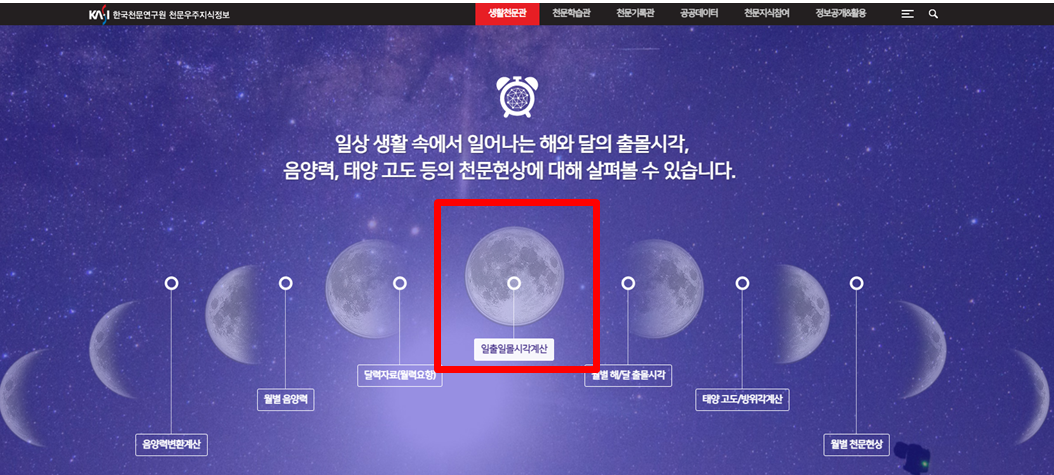 한국천문연구원 홈페이지에서는 음력양력 변환계산, 월별 음양력, 월별 천문현상 등 다양한 서비스를 이용할 수 있습니다