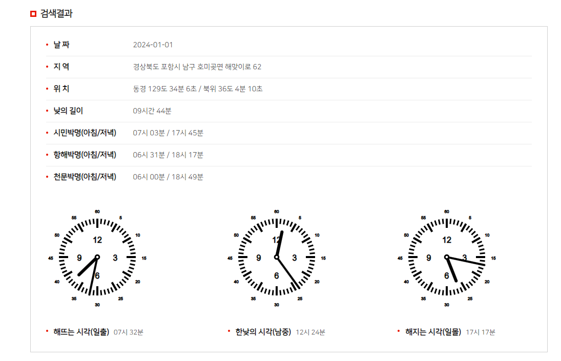 검색결과 호미곶의 위치, 낮의 길이 ,해뜨는시각,한낮 시각, 해지는 시각을 확인할 수 있습니다.
