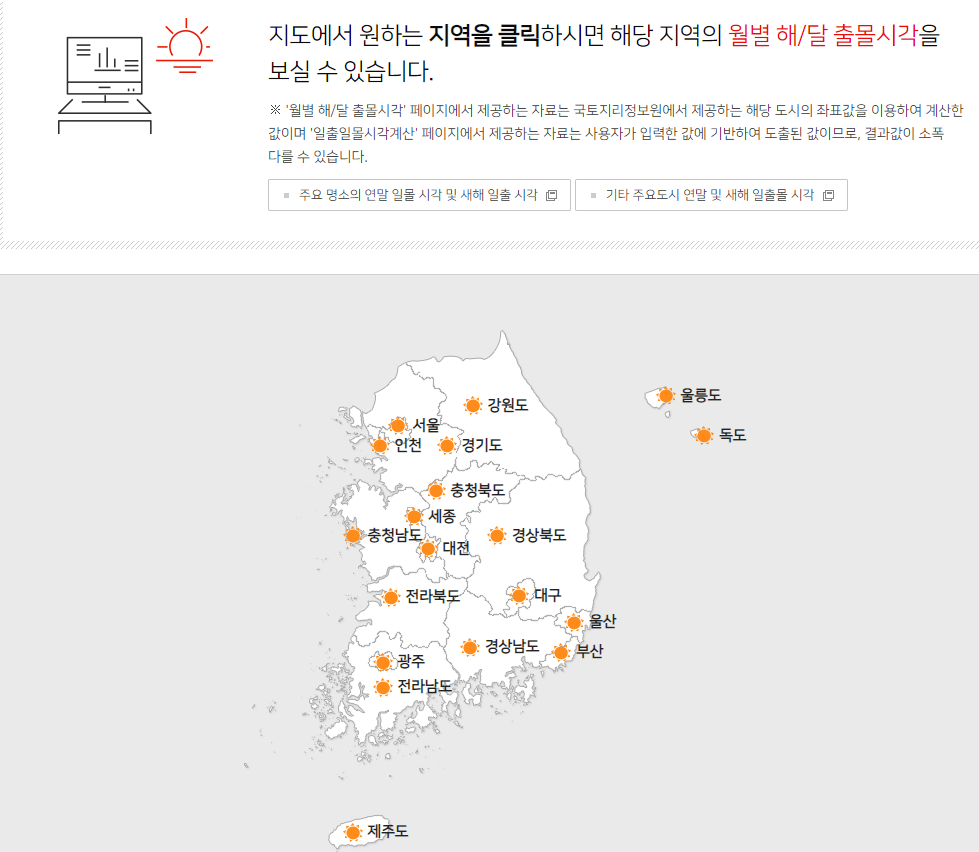 내가 있는 곳의 일출일몰 시간을 확인할 수도 있지만 주요 명소의 새해 일출시각도 조회가 가능합니다.
