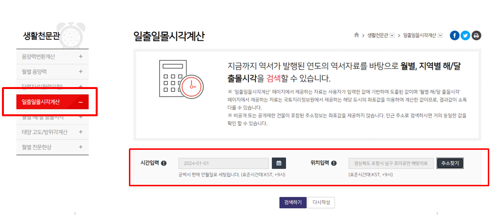좌측 메뉴부분에서 '일출일몰 시각계산'을 클릭합니다.